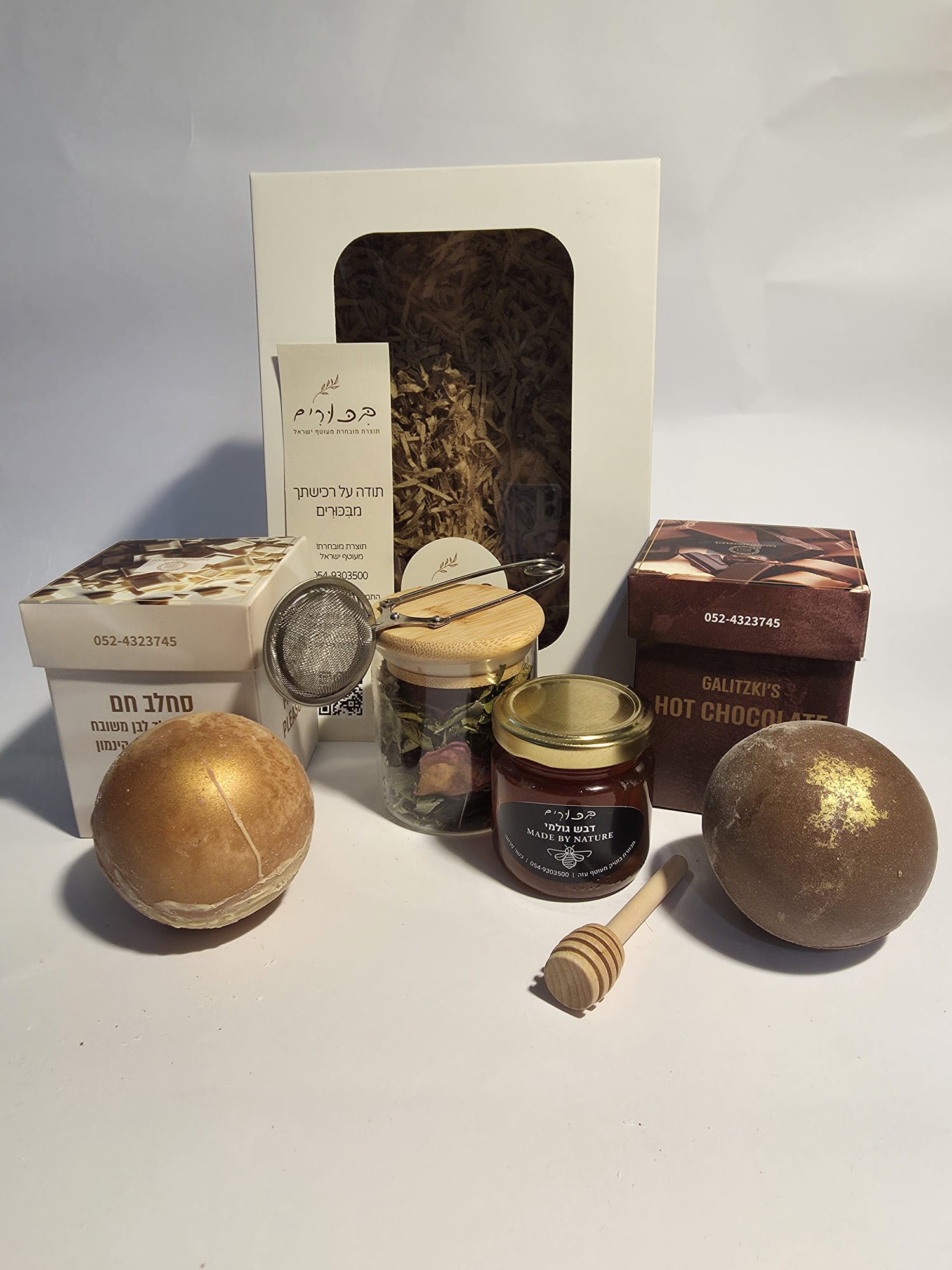כדור שוקולטה,כדור סחלב,דבש גולמי 250 גר',מטבל דבש מעץ,חליטת עלים,מסננת לחליטה,סימניה ביכורים.